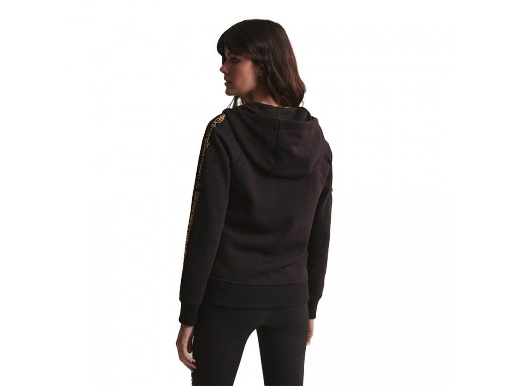 Černá dámská mikina na zip se zlatým logem Dakar a zlatými nápisy na rukávech se dvěma bočními kapsami a stahovací kapucí z oficiální dakarské kolekce.