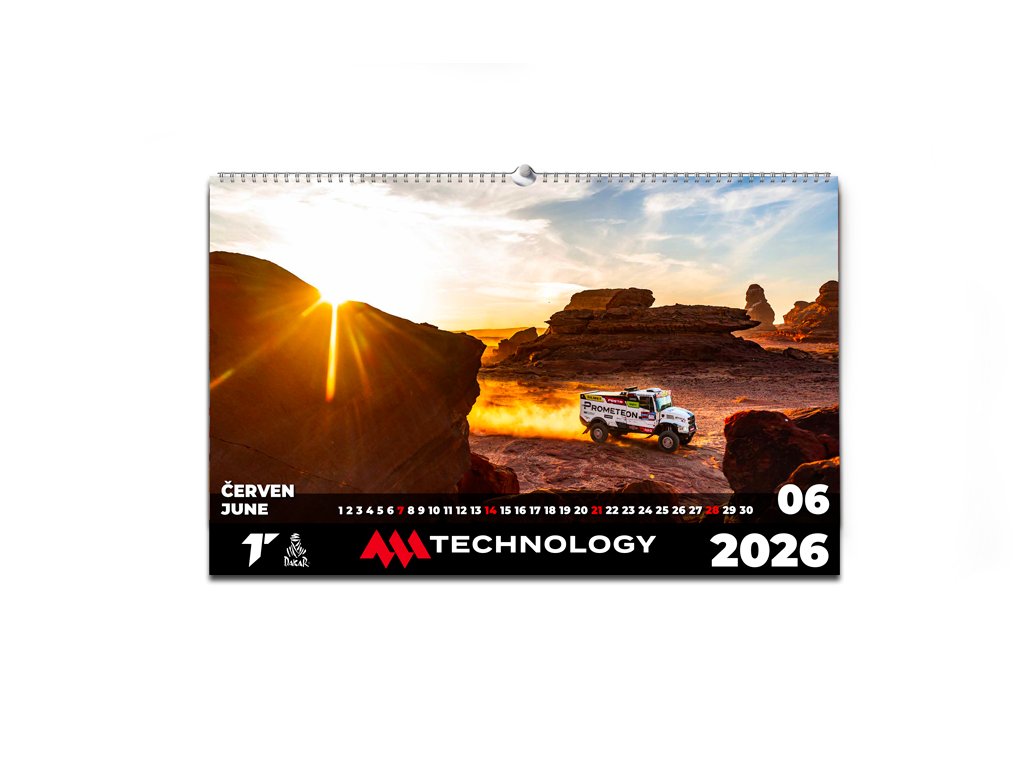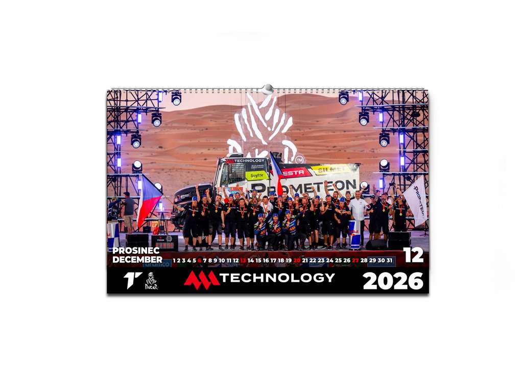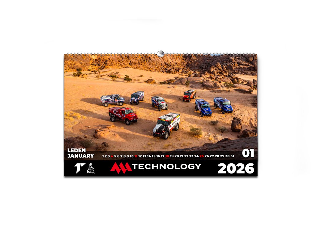 Celoročně na Dakaru? S kalendářem MM Technology žádný problém! Každý měsíc si můžeš připomínat vítěznou jízdu Martina Macíka, Františka Tomáška a Davida Švandy s Bohoušem pro druhé dakarské vítězství.